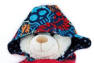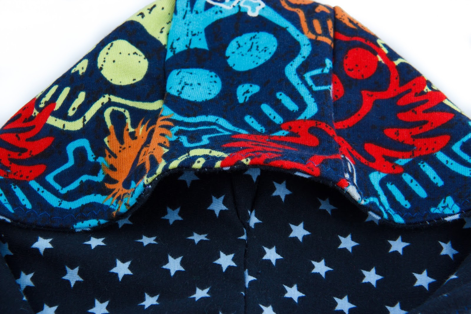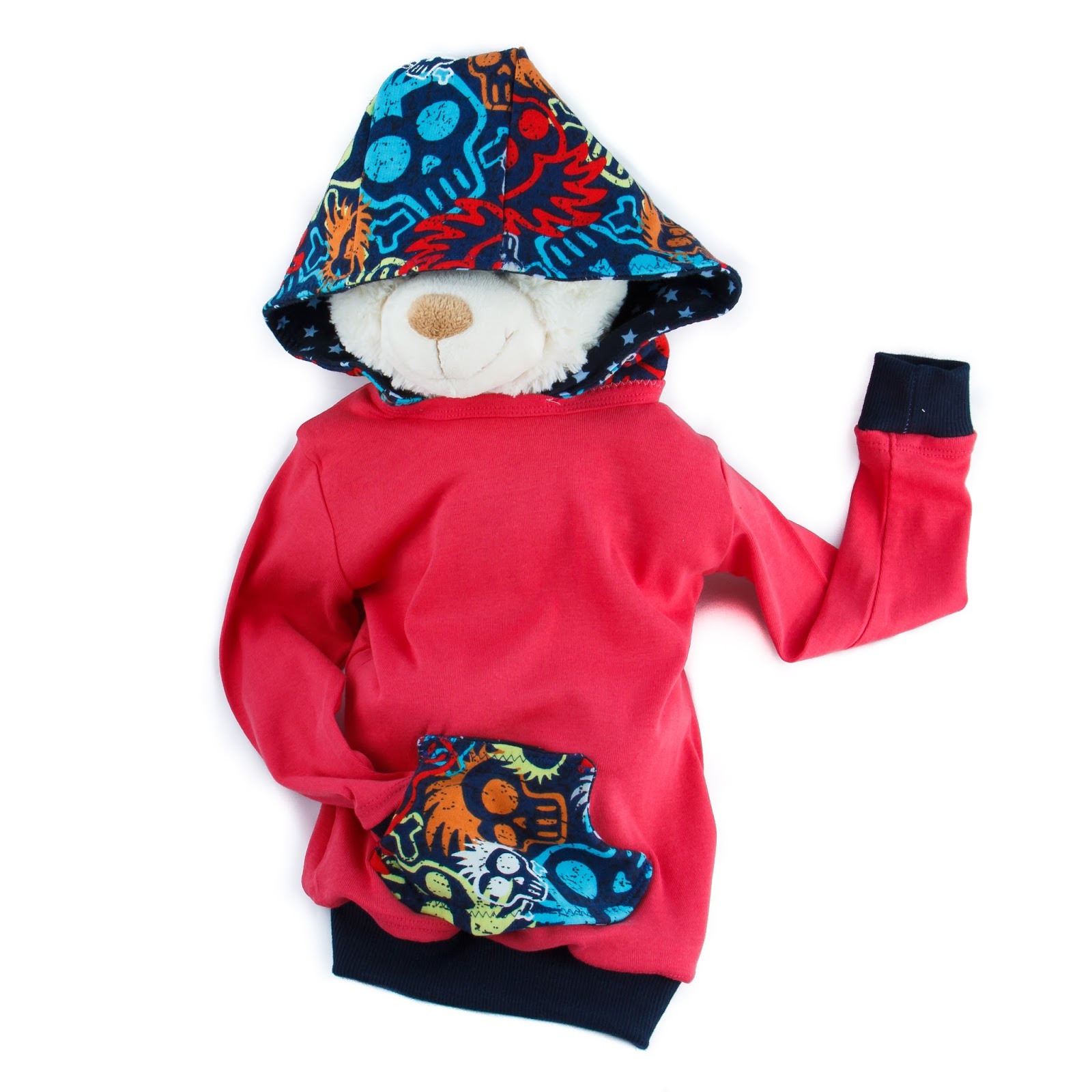 Aus dem Basic wurde ein außergewöhnlich cooles Longsleeve, für rockige Minimädchen! Mit schicker Kaputze für den Gangsta-Look! Die Kaputze ist aus buntem Totenkopf-Sweat und gefüttert mit dunkelblauem Sternchenjersey.