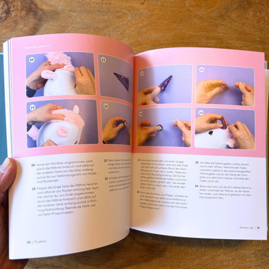 Das erste Nähprojekt, die Katze, ist auf 4 Doppelseiten etwas ausführlicher erklärt. Die anderen Projekte verweisen dann immer zurück auf die entsprechenden bebilderten Nähschritte dort und kommen deshalb dann mit je 2 Doppelseiten aus. Das Einhorn hat nochmal 3 Doppelseiten lang Platz, da hier mehr mit der Hand genäht wird. Auf den hinteren Buchseiten findet man dann noch zahlreiche Gesichter als Vorlagen.