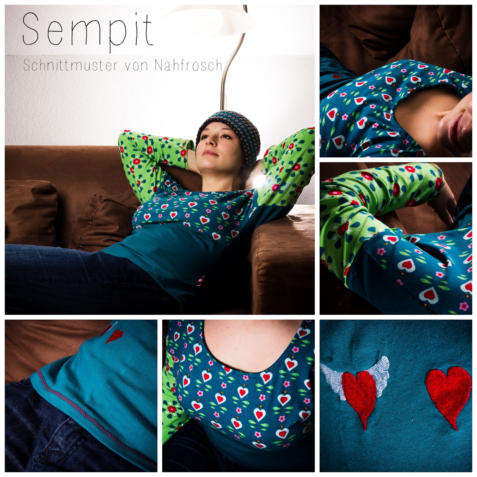 Das Shirt Sempit ist körpernah geschnitten und hat einen U-förmigen Ausschnitt, aber nicht zu weit. Hier in dieser Variante habe ich den Ausschnitt mit einem Beleg genäht. Irgendwie kräuselt es sich ein bisschen, aber das gefällt mir jetzt sogar besser als wenn es ganz glatt wäre. Die gemusterten Stoffe sind von Lillestoff. Bestickt habe ich mein Shirt seitlich vorne mit zwei kleinen Herzchen. (Das war ein Freebie aber ixh weiß grade garnicht mehr woher…) Verziert habe ich den unteren Saum und die Ärmelenden mit einem Fake-Coverlockstich in knallrot und an der einen Seitennaht habe ich 2 Webbandfähnchen eingebaut.