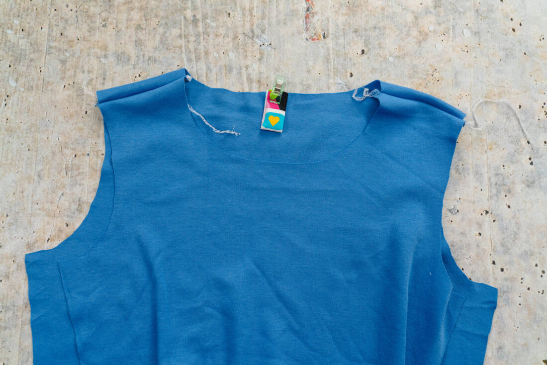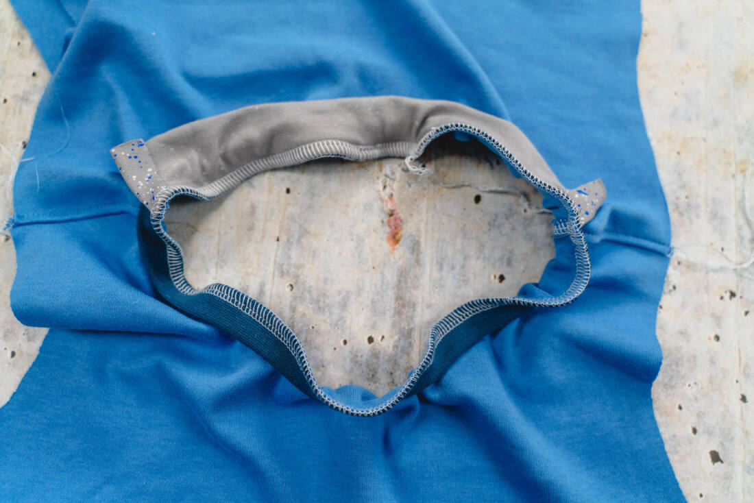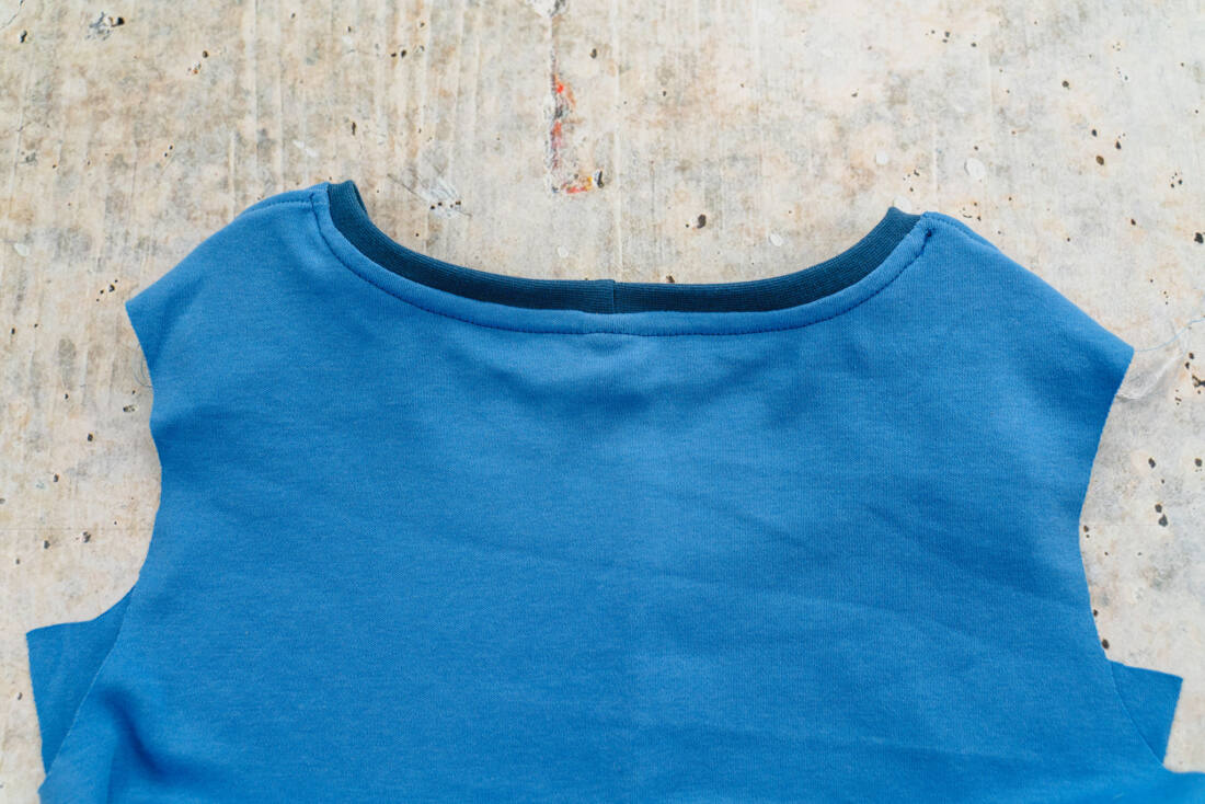 Nähe den Jerseystreifen von Schulter zu Schulter knappkantig fest. Achte darauf, dass es beim Nähen keine Falten gibt. Ggf. den Nähfußdruck senken und eine etwas größere Stichlänge wählen. Idealerweise einen elastischen Stich verwenden.