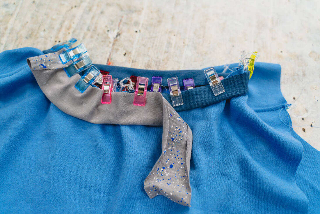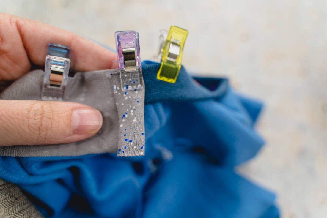 Klappe den Jerseystreifen einmal nach innen ein um die Nahtzugabe und stecke das Ganze fest.